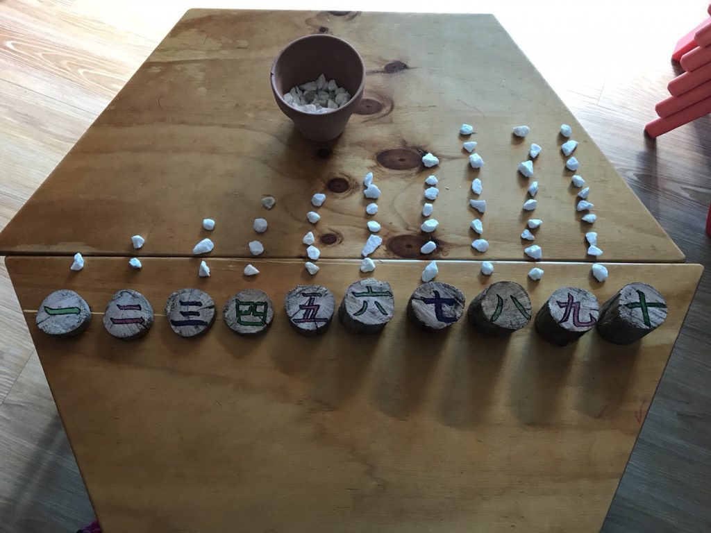 木を円柱状に切った物に日本の漢数字を1から10まで書いておいて裏にはわかりやすいように1,2,3,4,5…と書いています。