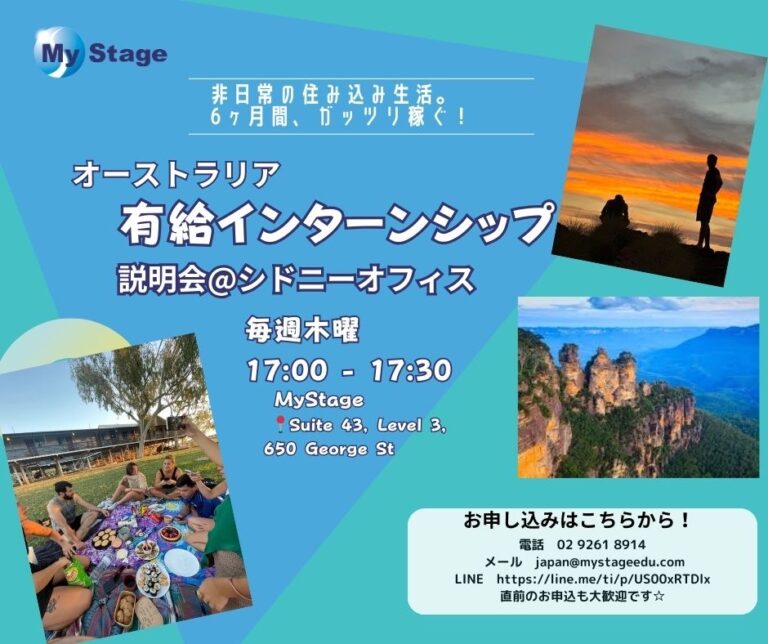 【専門学校とコラボ企画】学生ビザでもフルタイムで働ける!6ヵ月有給インターンシップ インターンシップに強いMystageとシドニー・ゴールドコーストの専門学校のコラボ企画!! 史上初! […] 続きを読む