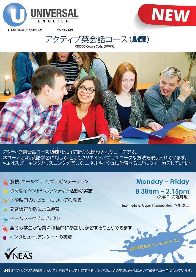 メルボルンにある語学学校、Universal Englishの ACEコース。