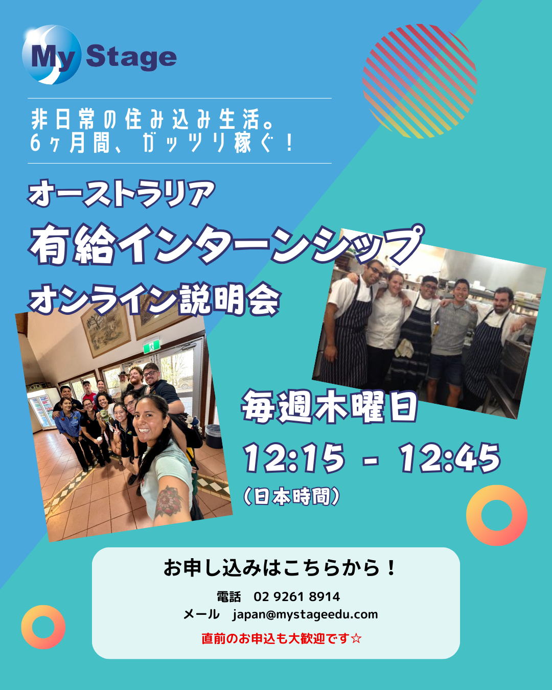 ワーキングホリデーの方々に大人気の「有給インターンシップ」について、マイステージでは毎週木曜日にオンラインでの説明会を開催しております。
