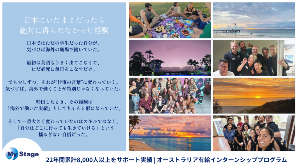 MyStageの【有給インターンシップ】は、オーストラリア全土の5つ星ホテルリゾートホテルなどの現地企業で働きながら、収入を得つつ実務経験も積めるワーキングホリデー向けのプログラムです。