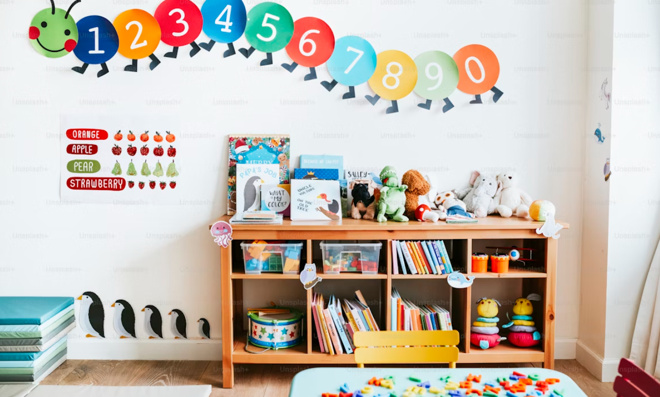雨の日には室内でお絵描き、パズル、かくれんぼなどもしました。子どもは25人で、4~5人の先生と一緒に見ていました。
