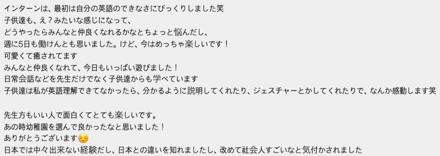 ★幼稚園以外の、大学生春休み/夏休みインターンシッププログラムの体験談は、こちらから見ることができます👇