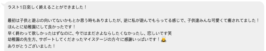 MyStageのスタッフもインターン先の幼稚園を訪問したことがありますが、子どもたちが本当に可愛くて癒されたそうです^^
